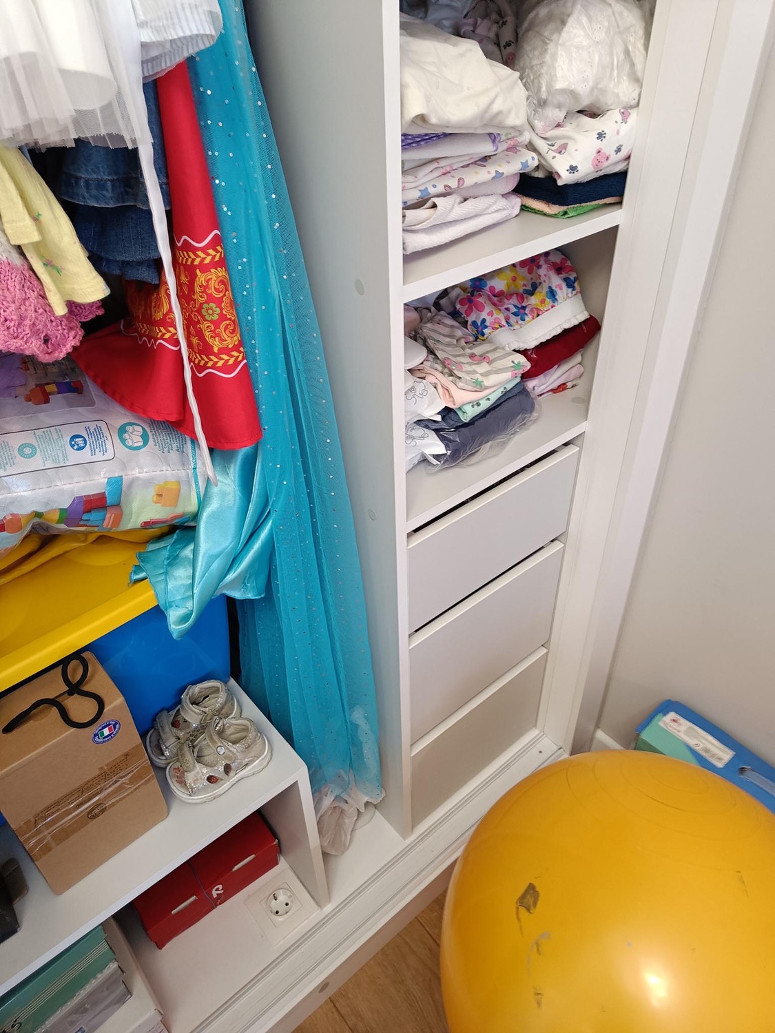 Шкаф предназначается для ребенка на вырост, поэтому здесь есть большое количество полок и по 3 выдвижных ящика в левой и правой секциях шкафа. Ящики на направляющих полного выдвижения, с доводчиком.