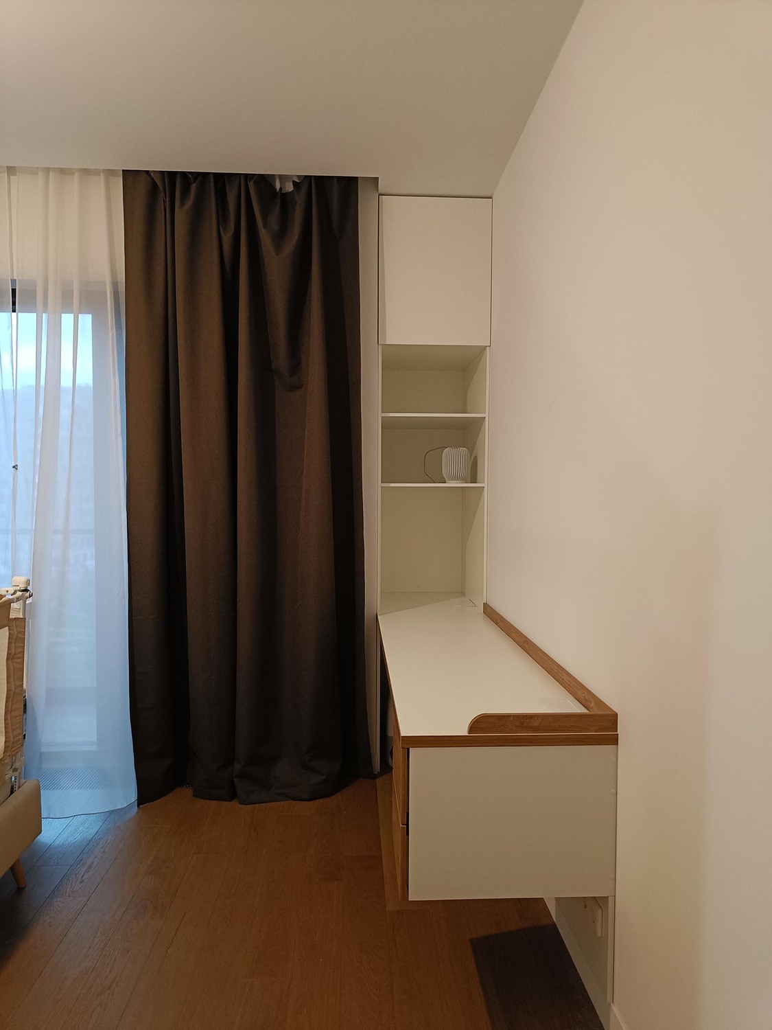 Рабочая (детская) зона состоит из шкафа-стеллажа, встроенной тумбочки и собственно большого пространства для работы и учёбы - столешницы, которая подвешена к стене, благодаря чему конструкция является парящей.